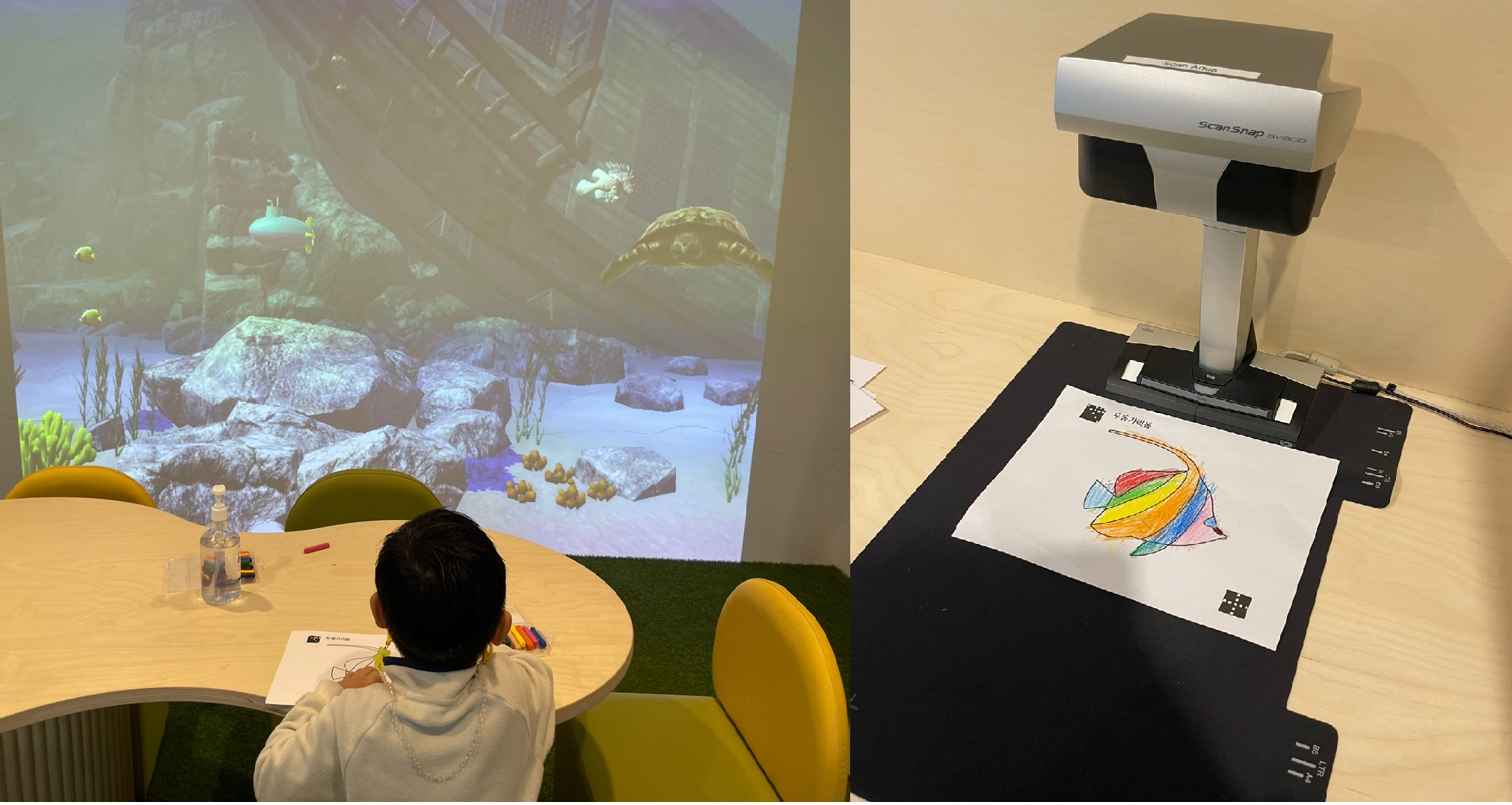 요렇게 그림을 그리고 스캐너에 올려 스캔버튼을 누르면 물고기가 스크린 속을 유유히 헤엄 쳐 갑니다. 아이들이 정말 좋아하는 디지털체험입니다.