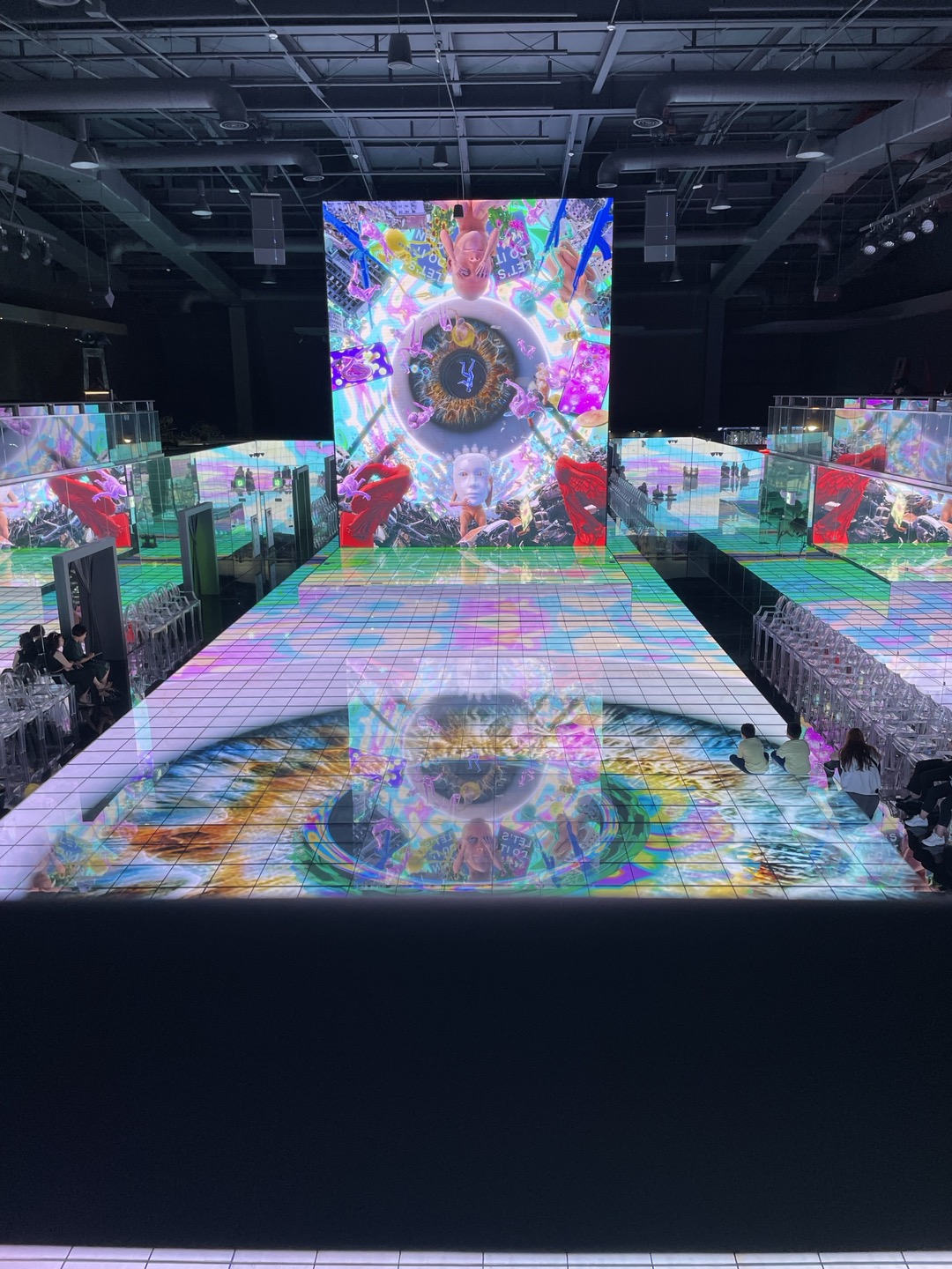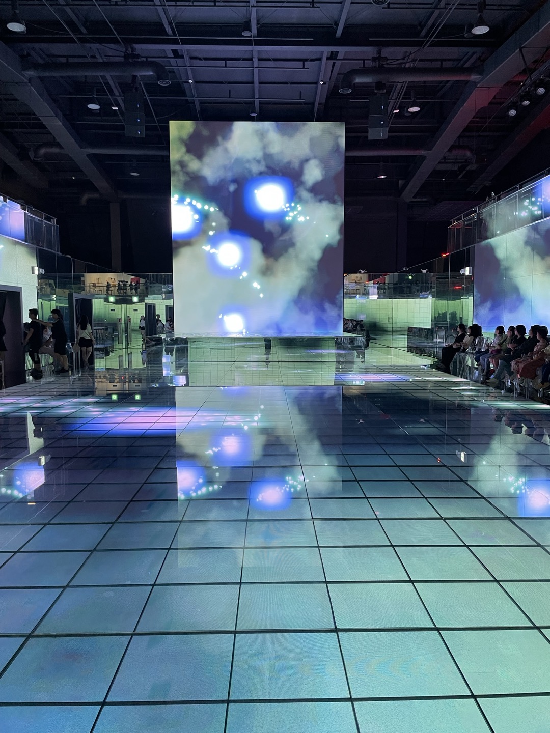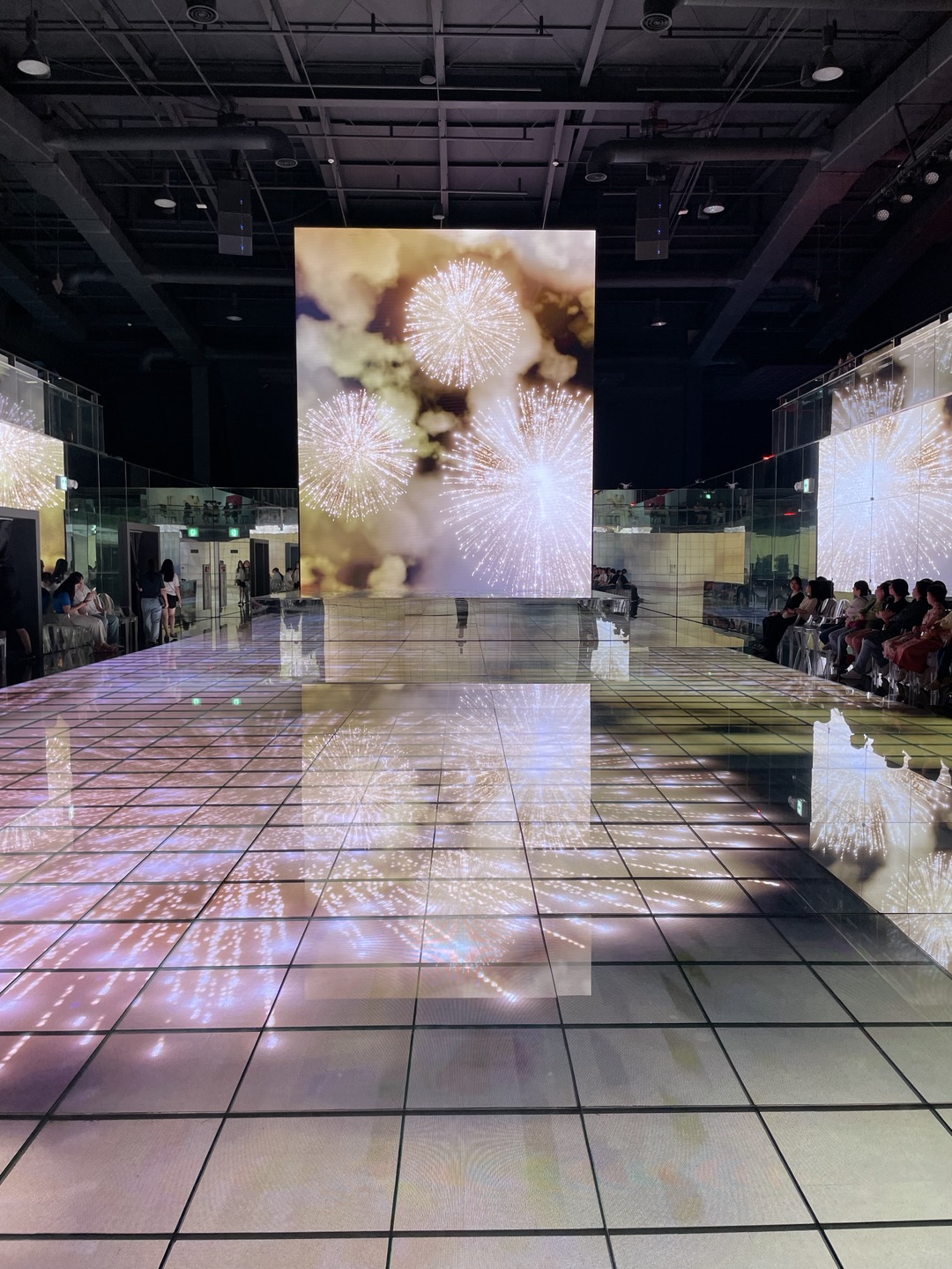 '아.. 이런 느낌의 다소 추상적인 조형물들이구나'하고 다소 성급한 판단을 내렸는데, 로봇 등을 비롯한 몇 가지 조형물을 지나치자 나의 눈을 사로잡은 것이 따로 있었으니, 공간의 전방위를 스크린으로 채워버린 바로 이 공간!! (이 공간의 이름은 아직 뭐라고 불러야 할지 모르겠음)